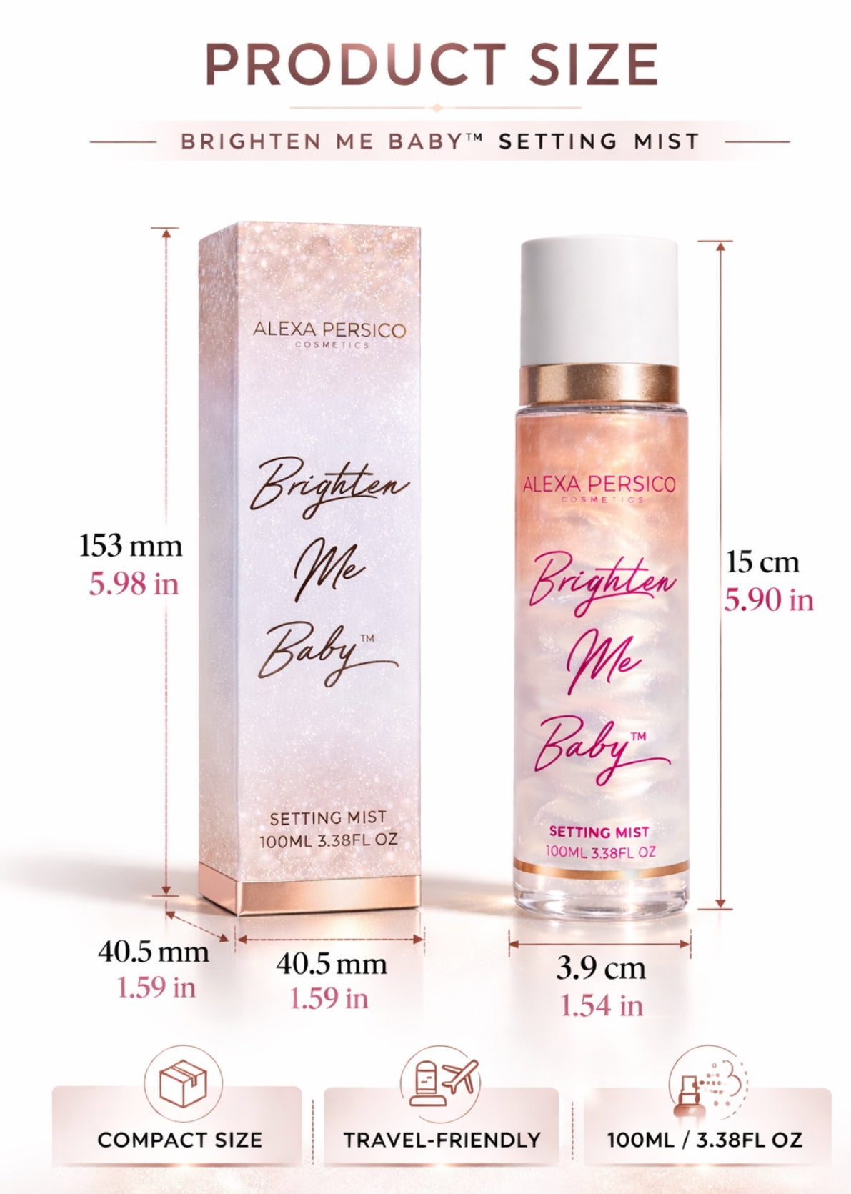 This Mist is designed to give the skin a soft, natural radiance and hydrated glow. For a more intense, high-impact shimmer, layer with our Brighten Me Baby™ Highlighter Palette.